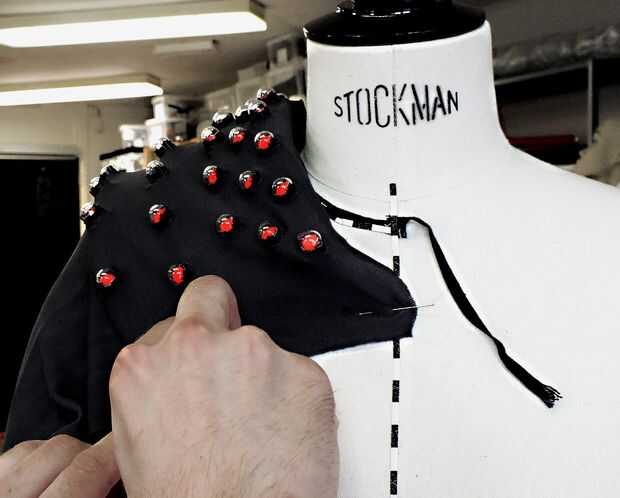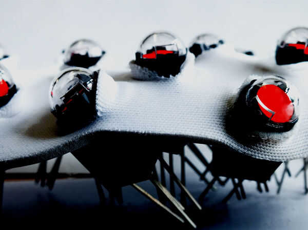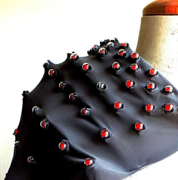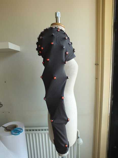 Desarrollar su diseño: Piense en donde desea colocar el tirón puntos, teniendo en cuenta qué tipo de efecto visual que desea crear y cómo eso influye en la construcción de la prenda. Experimenté con el patrón de los puntos haciendo diferentes cortinas de soporte, por el que pegué los puntos en los agujeros de la tela, creando un bonito arreglo que seguiría el cuerpo de una manera atractiva. Coloqué muy denso, porque eso haría más evidente el efecto de una pantalla. Pero tienes que tener en cuenta que a pesar de que puede colocar los puntos justo al lado del otro, puede que necesite algo de espacio entre ellos para dar cabida a otros componentes como diodos y cables.