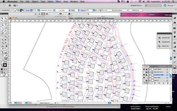 Puesto que los puntos tirón tenían cierta altura, decidí colocarlos dentro de una ligera espuma luminosa. Así que quedaría muy bien en su lugar. Para crear el patrón de los puntos a, se puede utilizar Illustrator o cualquier otro vector basado en software de dibujo. Escaneé mi patrón de papel con la colocación de todos los puntos, dibujado manualmente. Entonces había trazado en Illustrator y añadió los números para todos los puntos que podrían ser grabados en la espuma. Esto más tarde me ayudó al soldar las conexiones.