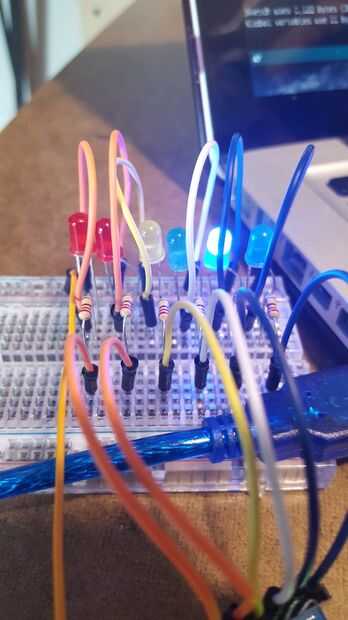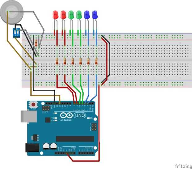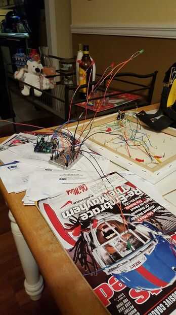 Ahora es tiempo de poner todos los componentes juntos! Primero permite el diseño de la placa. Sólo tienes que seguir imagen *, y los cables son color coordinado excepto los hilos de LED rojo y el cable de 5v rojo. Una vez que está puesto completamente hacia arriba, subir el código a tu arduino y compruébelo. Si no funciona entonces Compruebe las conexiones de cable y asegúrese de que el código es verificado por el programa de sketch de arduino. Lo que debe suceder es el LED se encenderá encendido en procesión programada de uno al otro en un bucle, y tocar los puntos de contacto al mismo tiempo debe apagar las luces completamente.