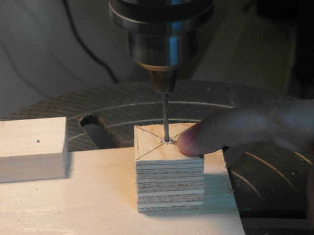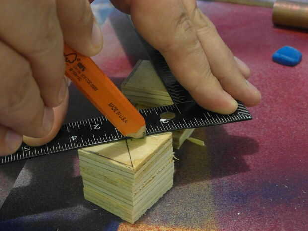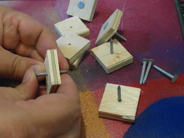 Cortar la madera en cuadrados de 1 1/2 "x 1 1/2". Para ahorrar tiempo, puede cortar la madera en tiras de 1 1/2", luego apilarlas para cortar cuadrados. Dibujar una X a través de las diagonales para encontrar el centro, y luego perfore un agujero ligeramente más pequeño que el diámetro del clavo. Usted puede apilar otra vez para ahorrar tiempo de perforación. Si usted está tan inclinado, lijar (no molestar). Presione o martillo un clavo en el agujero. Si ha perforado el agujero demasiado grande, utilice una gota de pegamento para mantenerlo en su lugar, pero mina ha hospedado ajustada por años sin pegamento.