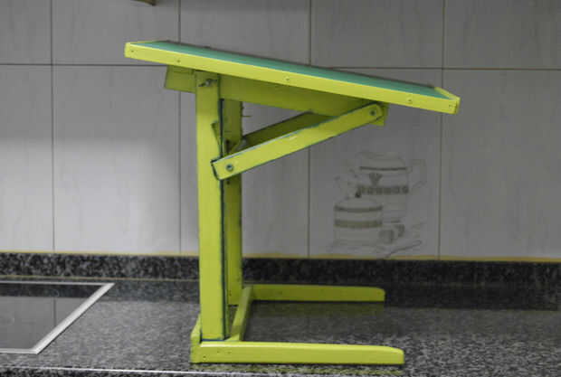 La patas de las de exterior de madera, tambien tiene los topes donde se sujetan los tirantes marcan la inclinacion de la mesa. Estos tirantes estan unidos con los ejes metalicos (de aluminio hueco) estan embutidos en una barra redonda de madera (del palo de escoba) y sirve para manejar la inclinacion de la mesa.