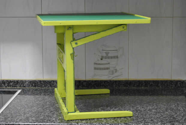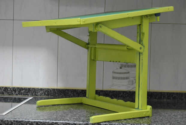 Madera exterior las piernas, también tiene paradas en donde se celebran los cinturones que marcan la inclinación de la mesa. Estas correas se unen con ejes de metal (aluminio hueco) que están incrustados en un redondo de madera de la barra (escoba) y sirve para controlar la inclinación de la mesa.