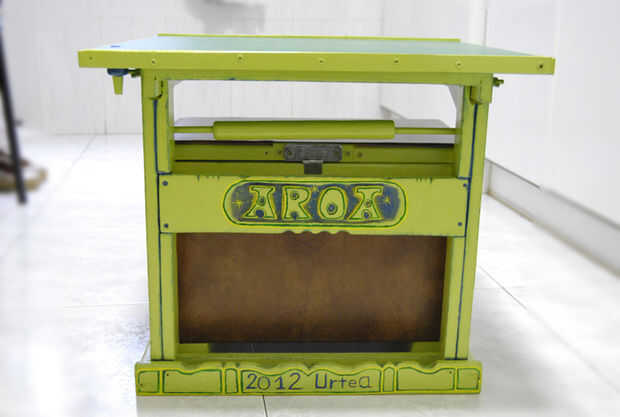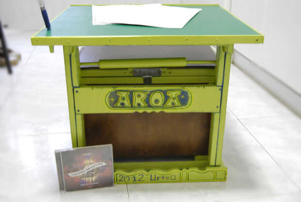 Aqui tenemos el conjunto final, preparado para su uso. Se puede colocar el baul debajo del pupitre, ocupando poco espacio, y separarlo para trabajar en el pupitre. Las dimensiones se aprecian comparando el tamaño de la caja de CD. Se puede ver en la foto nº 5, un boligrafo en el soporte e comentado antes.