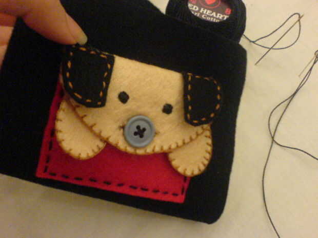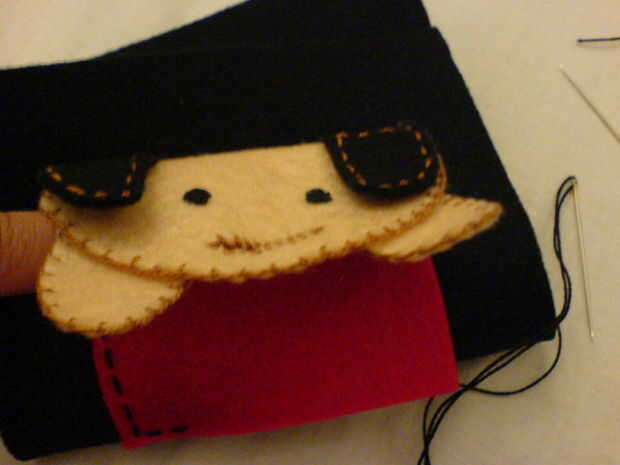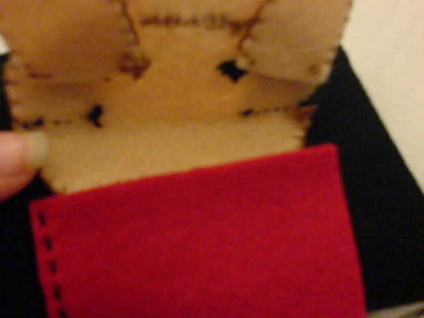 Coser el bolsillo rojo en el fieltro negro pero antes listo, coloque el botón en el centro y lo coser a