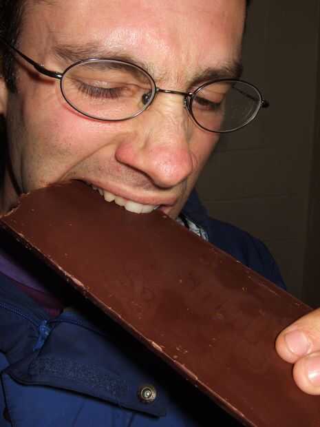 Convirtiendo literalmente el concepto de pies boca abajo! Para tomar su forma, este pastel en forma de una barra de chocolate se cuece al horno en 8 agujeros un poco profundas 12 hoyos cuadrados muffin/brownie (cada cuadrado 2-1/4 "x 2-1/4" x 1&