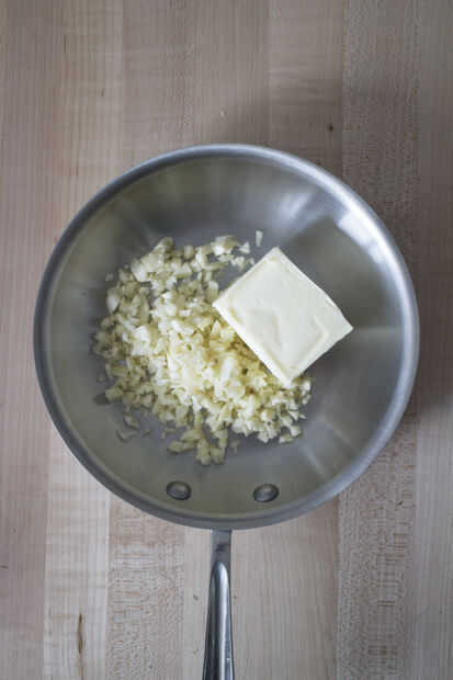 Poner el ajo en una cacerola pequeña con 4 onzas de mantequilla y a fuego lento a fuego lento durante mucho tiempo. Desea que el ajo para obtener realmente tierna, tarda unos 45 minutos para ello. Mantenga bajo el calor suficiente para que la mantequilla nunca burbujas o pops.