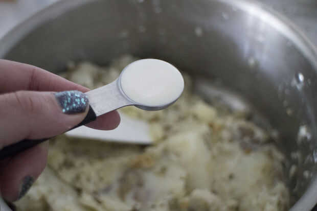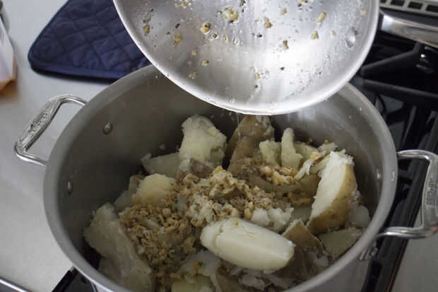 He añadido mi mezcla mantequilla ajo, así como mi leche y la crema de leche, a las patatas. MANTENER REVOLVIENDO y sal al gusto. Tus papas eventualmente llega a ser una gran consistencia, si encuentra que ser un poco demasiado aterronado, añadir más leche.