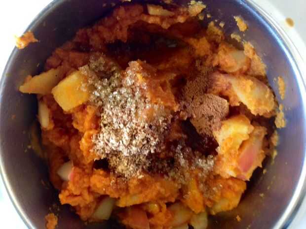 Después de cinco minutos, reduzca el calor a medio-bajo y añadir una taza de calabaza a las manzanas, mezclar.