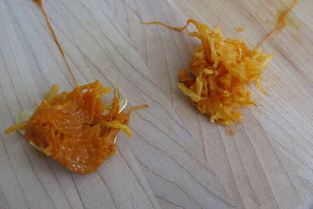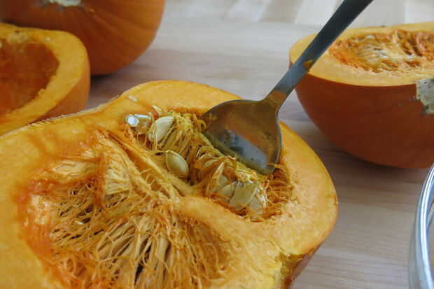 Para sacar las tripas de calabaza, una cuchara de metal funciona muy bien. Lo intenté con una cuchara grande para servir al principio y pronto se dio cuenta era demasiado grande. Una cuchara de metal regular era perfecta. Es importante que saque todas las semillas y el 'mal mugre' (ver foto). Si usted raspa demasiado comenzará quitando la mugre' buena' (ver foto), o la carne de la calabaza que se convertirá en puré.