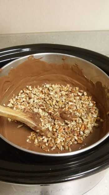 En una olla grande, vierta 4 tazas de agua. Coloque un recipiente de metal en la olla y vierta los discos de chocolate en el tazón de fuente. Coloque la olla a fuego lento. Revolver de vez en cuando hasta que se derritan, luego agregue 1 taza de nueces pecan.