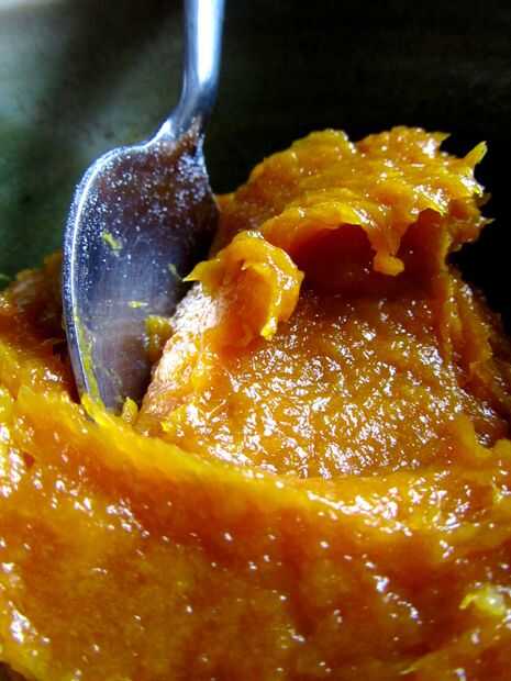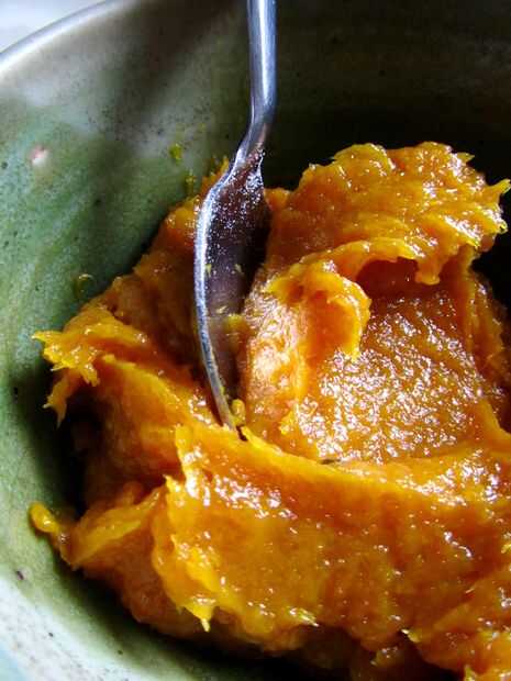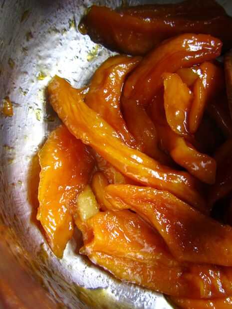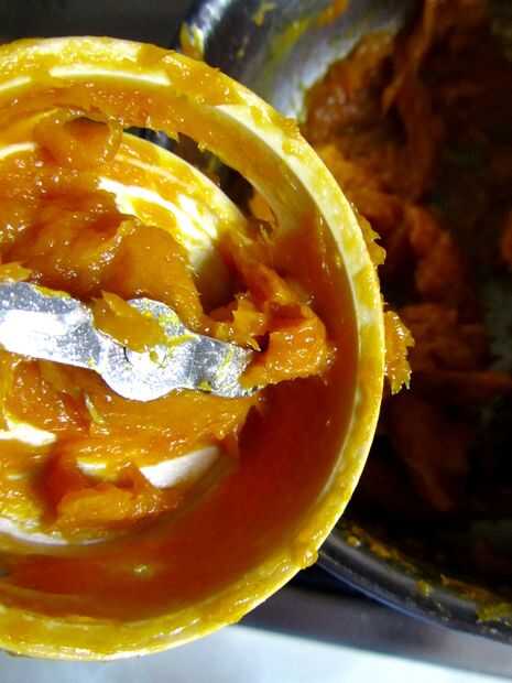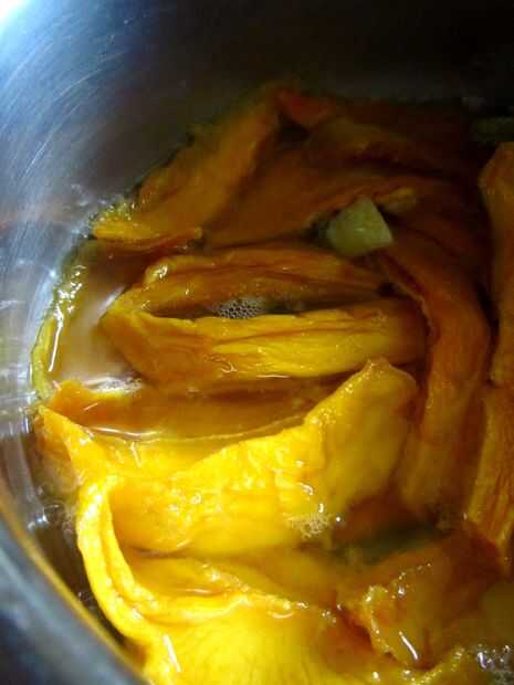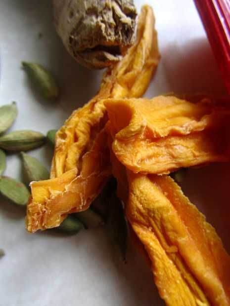 Todo lo que necesitas es una olla, una vitrocerámica, una especie de licuadora, 100 g secos fruta (yo usé mango por su magnífico tono naranja), tus favoritos especias y aromas (cardamomo y jengibre para mí), sobre una taza y media de agua y unas cucharadas de azúcar, dependiendo de qué dulce te gusta.