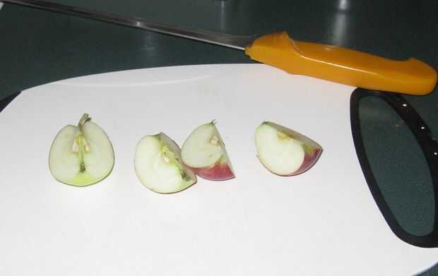 Cuarto de las manzanas y colocar en la olla de 10 litros, esto es un buen momento para quitar las partes malas.