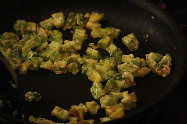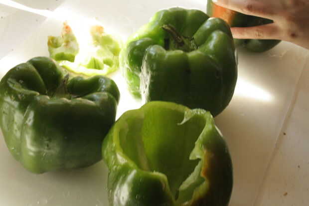 8. Tome uno de los pimientos y trocear en pedazos pequeños para el relleno