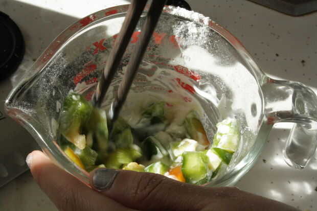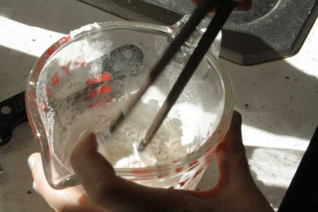 9. Mezcle un cuarto taza de harina y leche (o un huevo, no tienen huevos en el momento) para crear masa simple