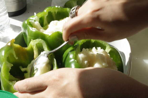 * en las fotos las encuentro y las verduras fueron agregados en primer lugar, seguido por puré de papas y luego se mezcla porque se preparó mucho puré de papas.