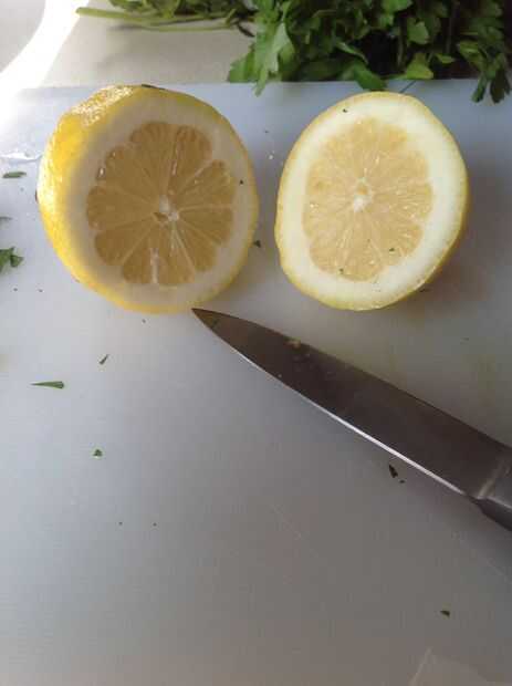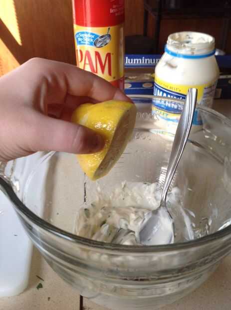 Corte el limón por la mitad. Toma una mitad del limón y exprimir el jugo en el recipiente. A continuación mezcle el perejil y el limón y la mayonesa.