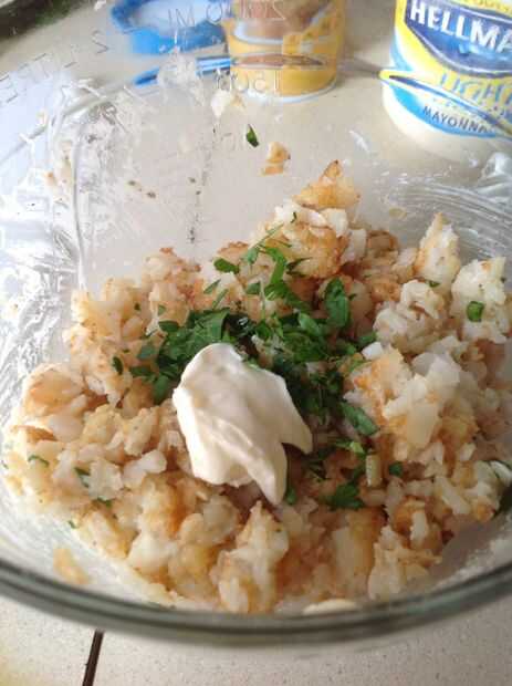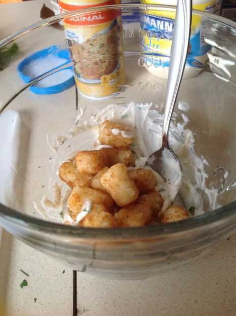 Lentamente añadir tots tater en el recipiente y puré para arriba. Agregar más de cualquiera de los condimentos perejil limón o mayonesa si es necesario!!
