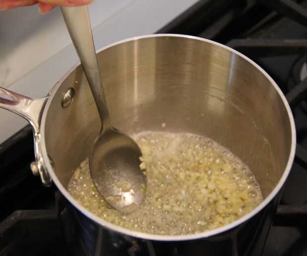 Me encanta patatas de ajo molido, así que estoy para saltear 3 dientes picados de ajo hasta agradable y brown (esto suaviza el ajo un poco!) en dos cucharadas de mantequilla.