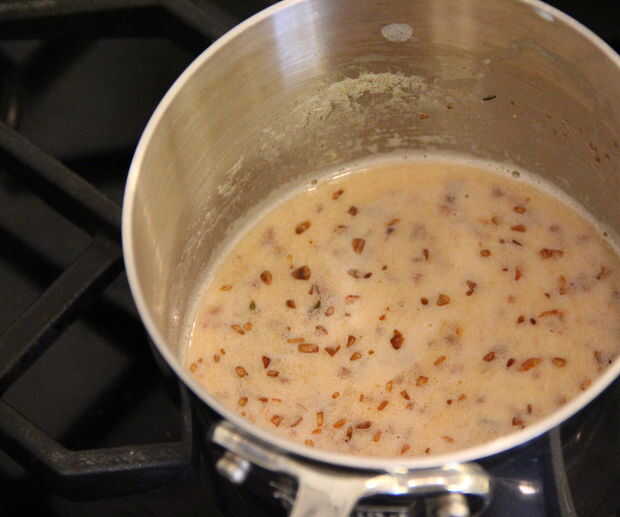 Una vez que has salteado las adiciones, vierta en la taza de leche o crema y gire el calor a calor bajo. Que este fuego lento, revolviendo cada tanto, mientras que hervir las papas.