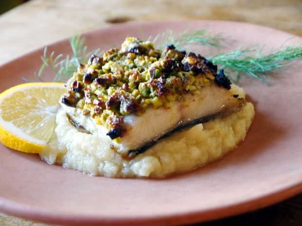 Celebrar los sabores saludables de invierno por hornear el bacalao con costra de parmesano pistacho y capas encima de un puré de manzana maravillosamente calentamiento de chirivía. Esta comida es segura para impresionar a la fecha, siendo muy fácil de preparar! También es ligero y fácil en el vientre - nada mata el romance como una comida pesada y coma alimentos!