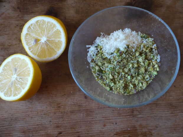 En un tazón pequeño, mezclar los pistachos, el queso parmesano, el aceite de oliva y el jugo de limón. Dejar de lado