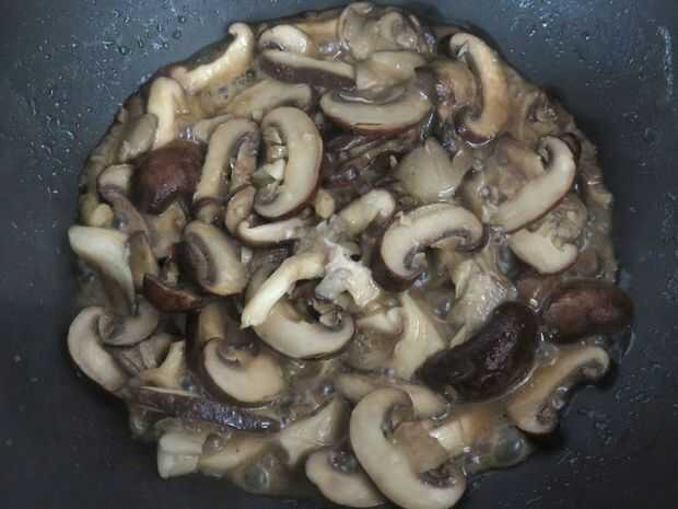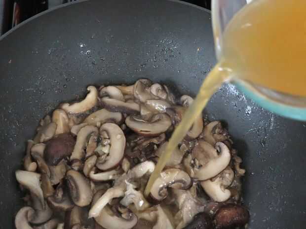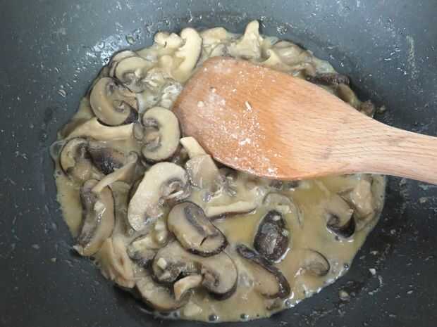 Añadir los champiñones y revolver hasta que están recubiertos con mantequilla. Cubrirlos y dejarlos cocer durante unos 5 minutos hasta que suelten sus jugos. Entonces añadir el vino, pollo stock y la crema, revuelva y deje ligeramente cocer a fuego lento unos 10 minutos más, hasta que el líquido alrededor de los hongos comienza a espesar y ha cocinado todo el vino de.