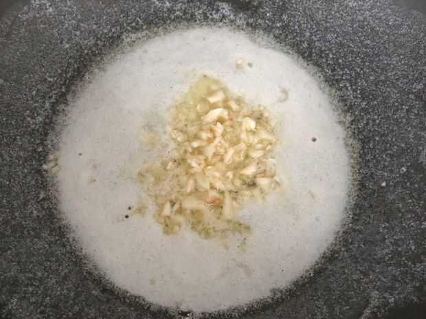 En una sartén grande sobre fuego medio, derrita la mantequilla, añadir el ajo y cocine por unos minutos.