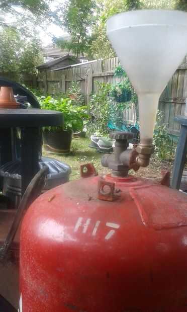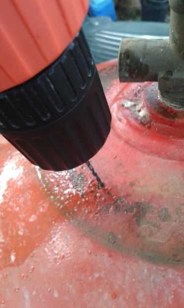 Llenar el embudo con agua abrir la válvula y esperar que el agua desplaza el gas. Es un proceso lento, el agua escurre en desplaza y pone el gas hasta una burbuja de gas se escapa pasando el agua, dejar el embudo casi vacío antes de llenararse como el gas tiende a ventilarse cuando hay menos agua en el embudo pero un embudo completo tiene el peso del agua para desplazar el gas, utilizaba jardín regaderas de 10 litros para hacer un seguimiento de cuánta agua había en el mantenimiento de un recuento de las latas en el lateral del cilindro. Asegúrese de que el agua esté libre de escombros (compuesto de pétalos de flores de cortes de la hierba! etc.) como el vacío de la válvula es pequeña y fácilmente obstruido. Una vez que el cilindro está completa y casi lleno de agua, agua ha dejado de ir y el volumen que ha puesto en está cerca el volumen calculado es el momento de perforar un pequeño agujero en la parte superior de riesgo usé un taladro y una broca de 2 mm, una vez que había tenido un corte en el cilindro lleno con un aceite ligero para reducir el riesgo de chispas y perforados a través de si el cálculo está hacia fuera (como mina por agua 4 litros los peligros de redondeo hacia arriba y hacia abajo de un error de 8%) ahora pasará mucho más rápidamente como las ventilaciones de gas a través del agujero del taladro. como el taladro agujero no es en la parte superior de la cúpula, una vez que el agua fluye fuera de la inclinación del agujero de taladro del cilindro por lo que el agujero es superior a la válvula. Debe haber una breve pausa como el último respiraderos de gas entonces un flujo de agua otra vez. Ahora es el momento más seguro para tomar una amoladora angular para una válvula soldada en guardia y desenroscar la válvula. Tomo nota que mientras que la Convención es que conexiones de gas combustible tienen una rosca de mano izquierda el hilo del cuerpo de la válvula en el cilindro en este caso fue una rosca estándar. Las breves notas que he leído en otros instructables sugieren vaciar y rellenar el cilindro antes de cortar con una amoladora. Con mi primer cilindro que pone en marcha el proyecto que lo quiero para necesario cortar la parte superior justo debajo del punto de la bóveda lo hice con una sierra mientras estaba todavía lleno de agua. Éste era desordenado ya que obviamente el agua empezado a correr hacia fuera tan pronto como la pared fue cortada a través.