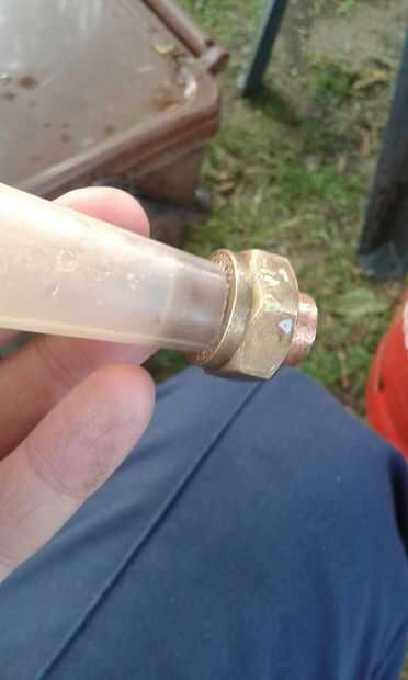 He encontrado una sección corta de tubo de cobre de 15mm con una aceituna fijada en el cuadro de chatarra. Me ajustado el extremo del embudo hacia abajo por lo que era un empuje firmemente en el tubo, colocado una tuerca de Unión en la tubería y forzado en el extremo del embudo luego conectada a la tubería en el cilindro.