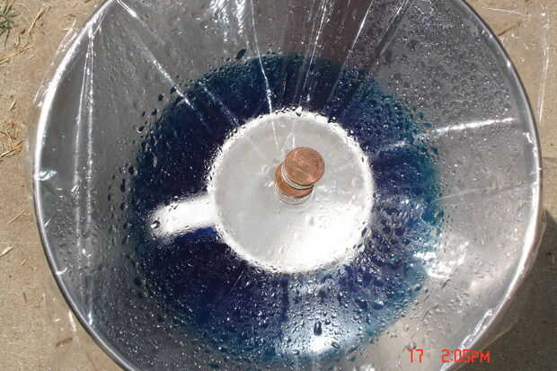 Cómo funciona: porque es un ecosistema (similar a una casa verde) el agua se calienta más rápidamente que normal.. .que hace evaporar, pero porque no tiene dónde ir, simplemente condensados en la parte inferior del plástico de envolver y sigue la curva natural del abrigo de saran debido al peso. El agua que gotea en la taza de color completamente gratis y sin sal. Esto es porque sal y colorante no se evapora con el agua.