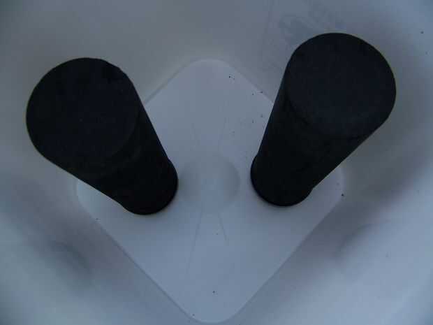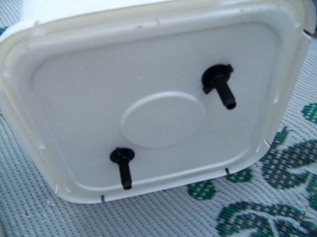 Se perforan dos agujeros de 7/16" a través de la parte inferior de la cubeta superior y la tapa de la cubeta inferior. Inserte los dos filtros de Berkey (preparados) en el cubo superior con el ojal de caucho entre el cubo y el filtro. Apriete las tuercas de los ejes de filtro con la tapa entre las tuercas y el fondo de la cubeta superior.