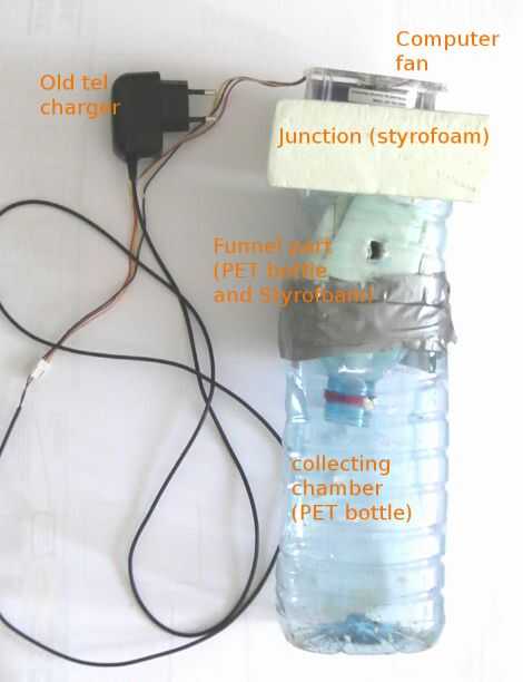 Monte al cruce de espuma de poliestireno hacia el cuello de la botella. Montar el ventilador en el cruce, asegurándose de que el aire se sopla hacia abajo.