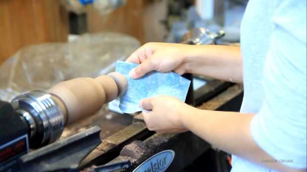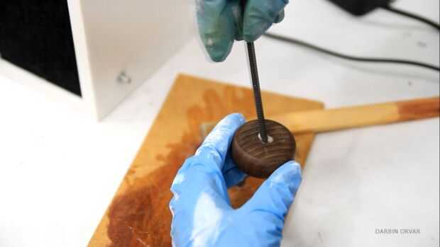 OK, ahora para hacer esa perilla en la parte un poco más cómodo hacer, decidí hacer una perilla más grande. Aquí le damos un trozo de nuez en el torno. Entonces yo sólo estoy perforando un agujero en él, por lo que puede caber alrededor de la perilla de metal. Y estoy epoxying la perilla grande en la parte superior el botón pequeño. OK, ahora que tiene que secar y estamos listos.