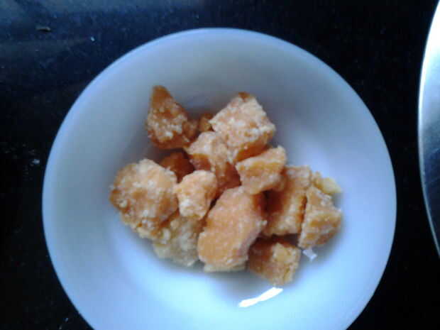 1/2 kilogramo de calabaza1/2 taza de azúcar3 cucharada de harina2 tazas de leche2 cucharada de mantequilla o ghee1 cucharadita de vainilla o rosa estáCoco, nueces, pasas de uvaPaso 1: Corte la calabaza en cubos pequeñosPaso 2: Poner en una cacerolaPa