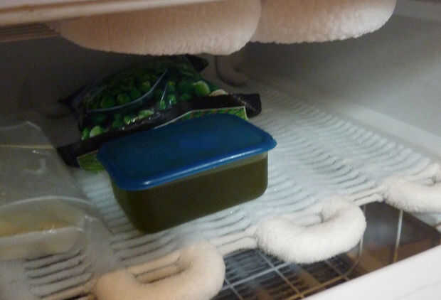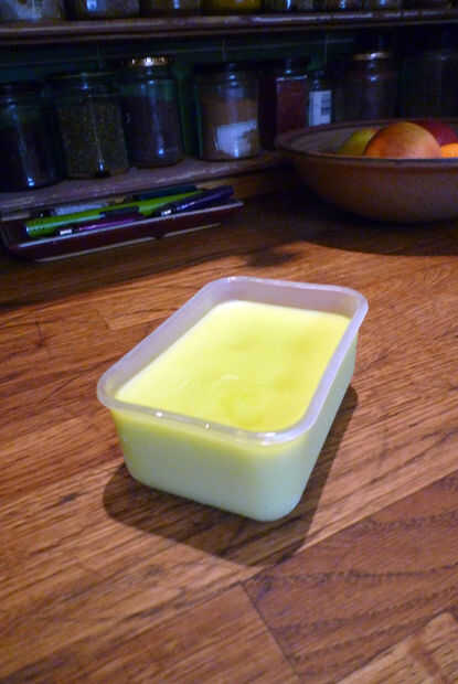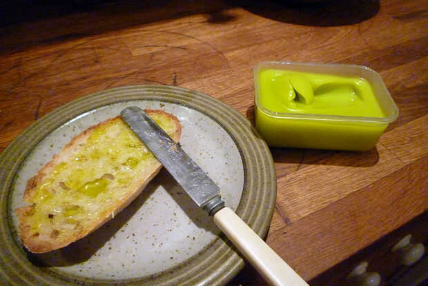 Vierta el aceite de oliva en la olla, no lo llena. Tapar y colocar en el congelador para cerca de 24 horas o hasta que esté sólido. Retirar de la nevera y dejar reposar por unas horas. Ahora debe ser una consistencia untable cremosa agradable. Mantenerlo en la parte trasera de la nevera o en el lugar más fresco. Poco a poco, se ablande durante un par de semanas - solo pop de nuevo en el congelador para la firma si es necesario. Usted puede encontrar resultados varían dependiendo de la temperatura de su refrigerador, clima, etc..