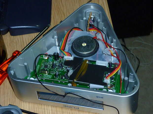 Identificar los dos cables sueltos en el lado derecho de la unidad en la foto. Estas van desde el pequeño PCB en la parte posterior con el brillo cambiar en él derecho hacia el frente y conectar a la luz del LCD. Están separados los cables rojo y negro. Todos los cables son cables de cinta de varios hilos conectados entre sí.