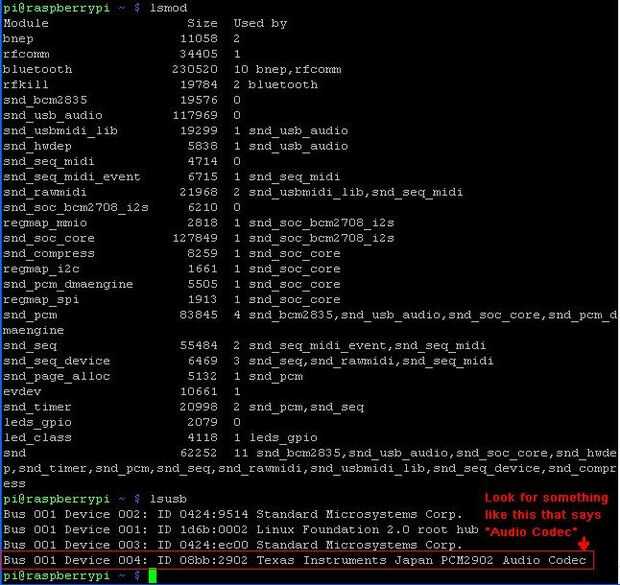Dependiendo de tu tarjeta de audio, puede que necesite descargar controladores o configurar los ajustes de audio de frambuesa Pi (yo uso ALSA estándar de Pi). Para mí, fue tan simple como enchufar el USB y escribe lsusb y lsmod (ésos son minúsculas L) en el Pi terminal para ver si estaba funcionando correctamente. Mayoría de tarjetas de audio USB debe trabajar fuera de la caja pero consulta la página del proyecto ALSA para asegurarse de que si tu tarjeta es compatible o no. Una vez que haya enchufado en el interfaz del USB es tan sencillo como ejecutar PD extendida (tipo extendido de pd en el terminal) y luego abrir el patch de PD prueba para ver que el audio está funcionando. (Nota: para ver el gráfico windows PD corriendo 'sin cabeza' es necesario utilizar un GUI como LXDE).