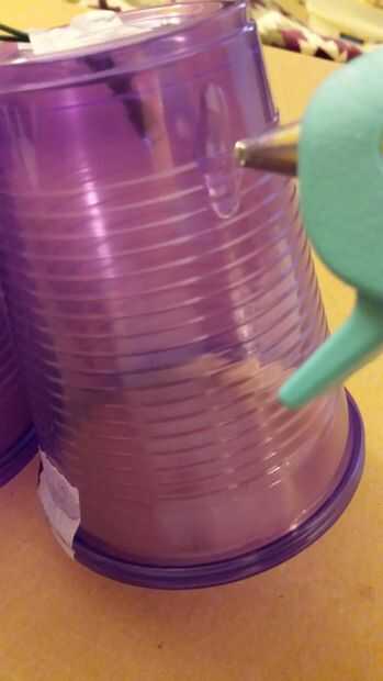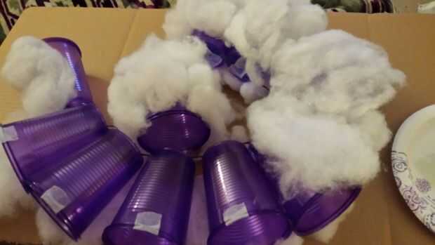 Pegamento caliente el relleno alrededor de cada taza. Me pareció más fácil de poner todo, pegamento de relleno a todas las tapas de las tazas, darle la vuelta para hacer el otro lado y luego llenar los vacíos. Deja el fondo de las tazas (donde estan los cables) expuesto por ahora.