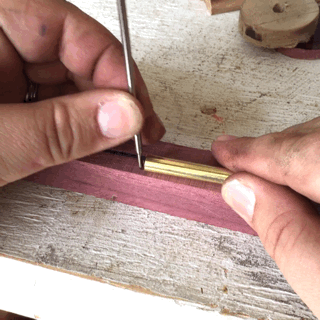 Los espacios en blanco en el kit ya cortaron a espesor bruto, pero siendo necesitan para cortar a la longitud áspera para los tubos de latón. La mayoría de guías hablará sobre las diferentes opciones para cortar los espacios en blanco y cómo debe salir sobre 1/4 de pulgada extra por el tubo. Tuve la brillante idea de usar mi sierra de calar. No es lo más preciso en mi tienda, pero la hoja definitivamente vagó sobre mí y casi me dejo con un corto en blanco. Recomendaría algo como una sierra de mano o sierra de mesa picar para un corte más predecible. Corregí el deambular por mordisquear lejos el ángulo él a la izquierda y utilizando la guía para evitar que la pieza que despide apagado la hoja. He ha utilizado para trabajar con el pino y el roble, la plataforma para que la purpleheart más difícil fue un poco más de una sorpresa. Asegúrese de marcar el espacio en blanco por lo que mejor puede hacer coincidir la dirección del grano. Si hay una parte más bonita del espacio en blanco, asegúrese de que está en la pluma (y no la cortada) parte de su trazado. Mi grano era bastante incluso a lo largo.
