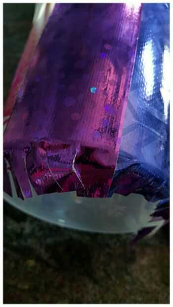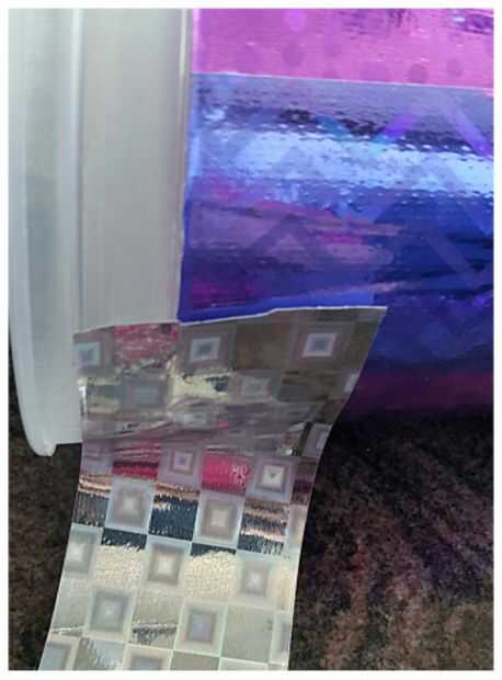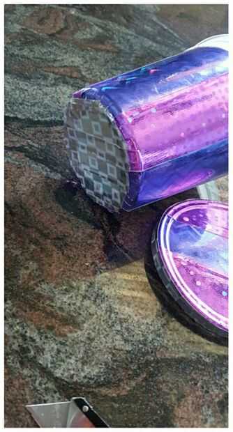 Su tercer color de cinta y enróllelo alrededor del labio de la tapa, pero mantenerlo suelto y asegurándose de que usted tiene una superposición de al menos 1/4". Corte secciona su rodillo de la cinta y coloque una vez más, ligeramente sobre el labio del recipiente. Tomar el cuchillo o las tijeras y hacer un pequeño corte en la cinta, aproximadamente 1/8" de más ancha que el labio. Rasgar la cinta todo el camino y colocar en el labio, esta vez teniendo cuidado de colocarlo correctamente y suavizar como vas. Se deben satisfacer o cubrir ligeramente la parte superior de la cinta de abajo. Voltear el envase y si no lo has hecho ya, hacer pequeños cortes, aproximadamente 1/4" de distancia, alrededor de la parte inferior donde la cinta extra colgando y presione cada uno abajo por separado. Asegúrese de que para cada uno tanto como sea posible. Una vez que haya terminado con eso, toma la izquierda en la plata (o cualquier color usted optó por utilizar) cinta aislante y cubrir las partes desnudas de la parte inferior. La mía es un poquito descuidado, como estaba en un apuro. Tómese su tiempo y que se vea bien.