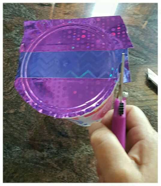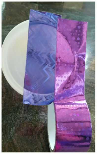 empecé con la púrpura más oscuro sobre toda la longitud del centro de la parte superior, dejando 1/2" saliente de ambos lados. Luego tomó el encendedor morado y comprometidos en ambos lados, dejando esa proyección. Ahora toma el clavo una vez más y asegúrese de que la cinta se adhiere hasta ambos sistemas de crestas en la parte superior. Toma tus tijeras y recorta todo el lide entero, asegurándose de que usted deje un excedente de 1/4"- 3/8". Suave todo abajo, alrededor de la tapa entera. Ahora Envuelva su color de contraste, todo el camino alrededor de la parte superior y dejar otro 1/4" saliente. Todo liso hacia abajo el párpado y utilizar su cuchillo para cortar la cinta de plata con la tapa.