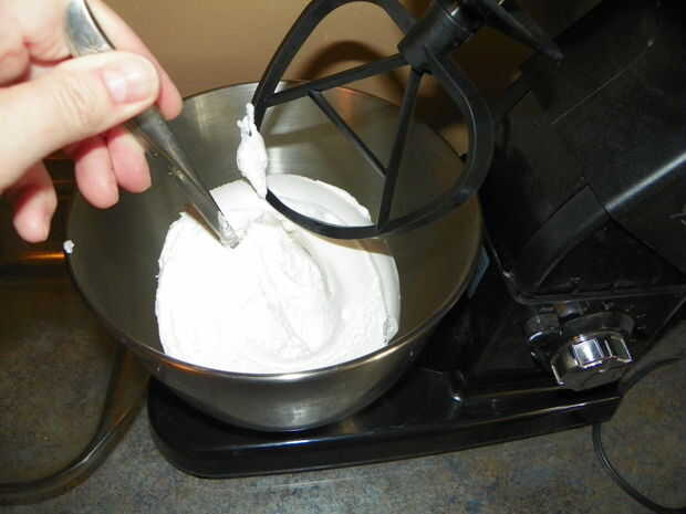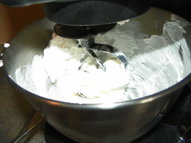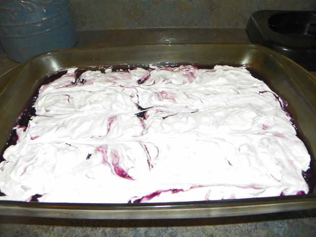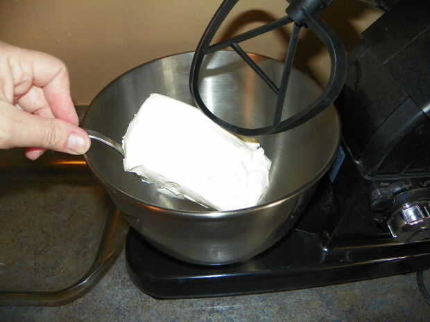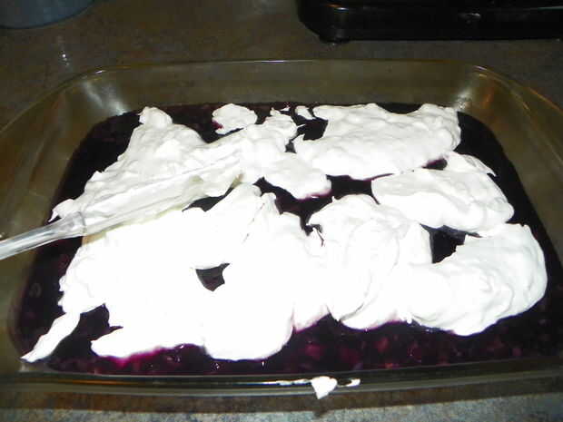 Combinar un paquete de 8 onzas de queso crema con un recipiente de 8 onzas de cool whip. Mezclar bien. Extienda esta sobre la gelatina.