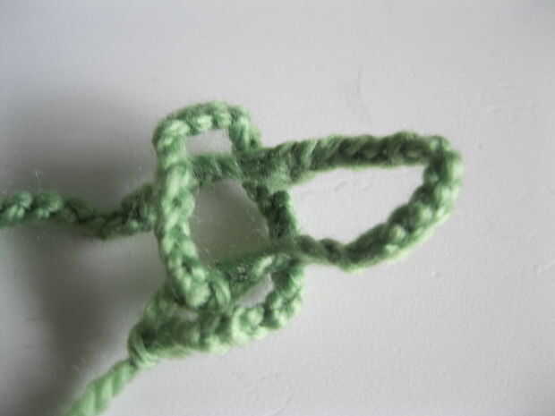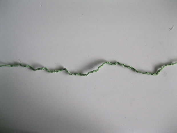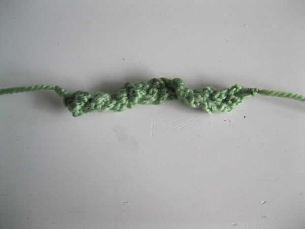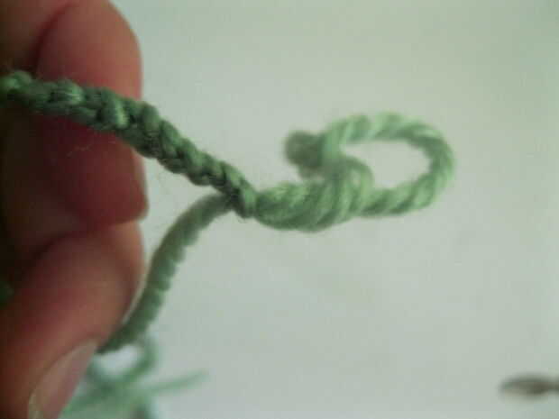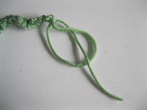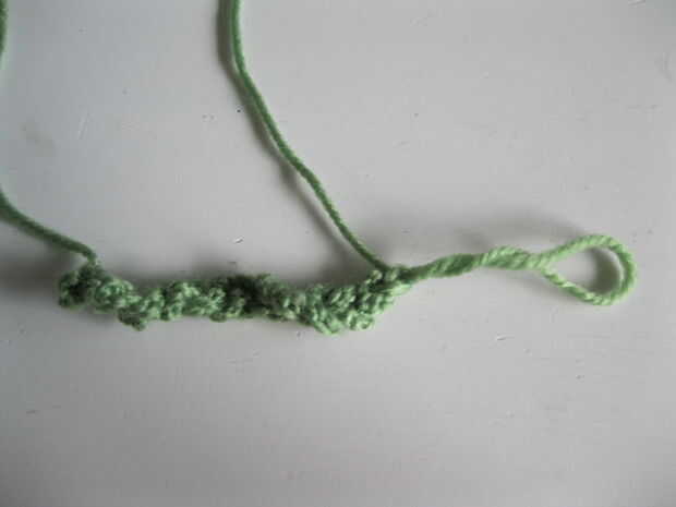 Con el ganchillo de dedo ligero de lana verde una longitud de lana hasta que es aproximadamente de 27 cm de largo.