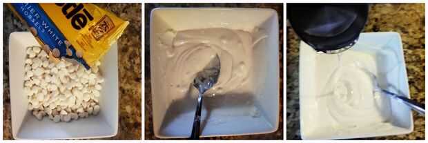 Primero derretir el chocolate en el microondas 15 segundos a la vez. Nunca quiere que te calientes demasiado, buscan tibio.