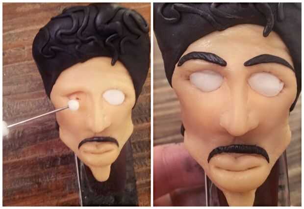 Agregar un bigote y cejas, agregando negro pequeñas tiras de modelado de chocolate con una herramienta de fondant.