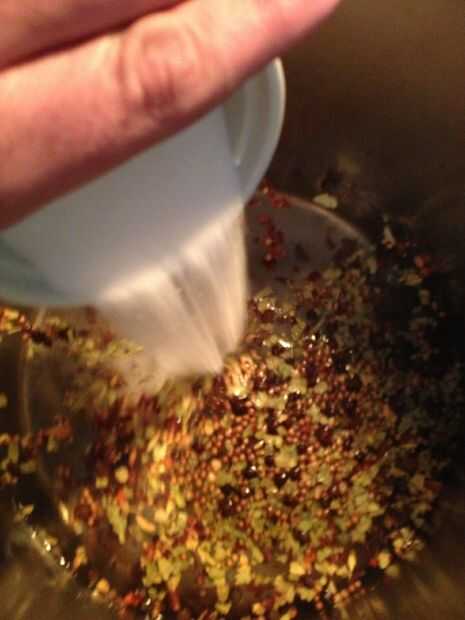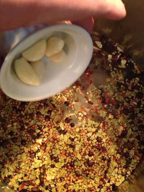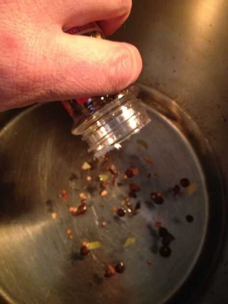 Añadir conserva en vinagre especias, escamas de pimiento rojo, sal, azúcar y ajo a la olla. Poner a hervir y apague la llama. Asegúrese de que se disuelven el azúcar y la sal. Deje que se enfríe.