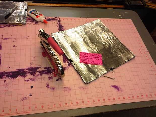 Pila 14"(35.56) cuadrados juntos. En esquina solo 1 perforar 2 orificios en 4 7/8"(? cm) de la esquina y 5/16 Avos (? cm) del borde. Apilar juntos ambos cuadrados de 8"(20,30 cm) y 8 agujeros, 2 en cada esquina en 1" (? cm) de la esquina y 3/8"(? cm) del borde.