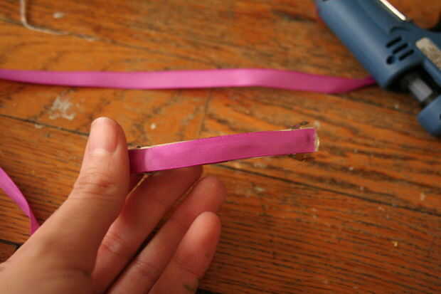 En primer lugar, cubrir la parte superior de la pinza de pelo con una cinta púrpura y asegúrelo en su lugar con pegamento caliente. Luego, cortar cualquier exceso.