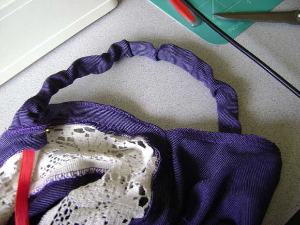 Las correas de mi Jammy tenían forma de mucho estiramiento para ellos. Tenía que acortarlos pero realmente no preste atención a sólo cuánto dan las correas tenían. Descubrí esto después de ya estaba cosido. Así que una vez más la reina tuvo que deshacer. Terminé solo partes descocidas la parte posterior ya que este tejido es tan difícil trabajar con. Después de mucha dificultad para insertar el elástico ( la parte superior de la taza del sujetador todavía fue cosida a la cinta por lo que no pude tirar a través), cosí el elástico de la correa, en el lado de la taza, lo más cerca posible a la Copa y el derecho de la costura a través de la correa. Por lo que no.