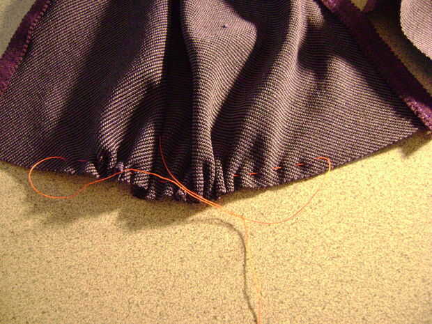 Tirando sólo 1 hilo sujetando el otro extremo apretado, recoja a la tela a lo largo del hilo hacia el centro. Unir los dos extremos de la puntada de hilvanado para que accidentalmente no tire del hilo a través de.